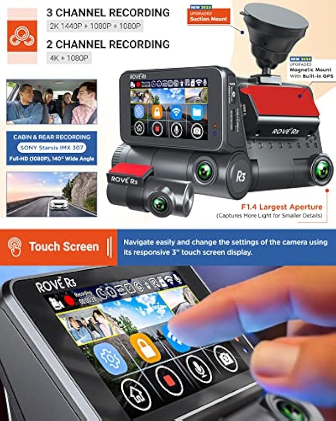 • 【Experience The Difference with ROVE】ROVE R3 is a 3 channel touch screen dash camera for cars. This is all you need for any dash cam need and enthusiast, period. It has all the bells and whistles with an industry-changing design that features 3 Inch IPS Touch Screen with just a single power button and the rest is done magically by ROVE's custom-designed firmware of this dash camera.