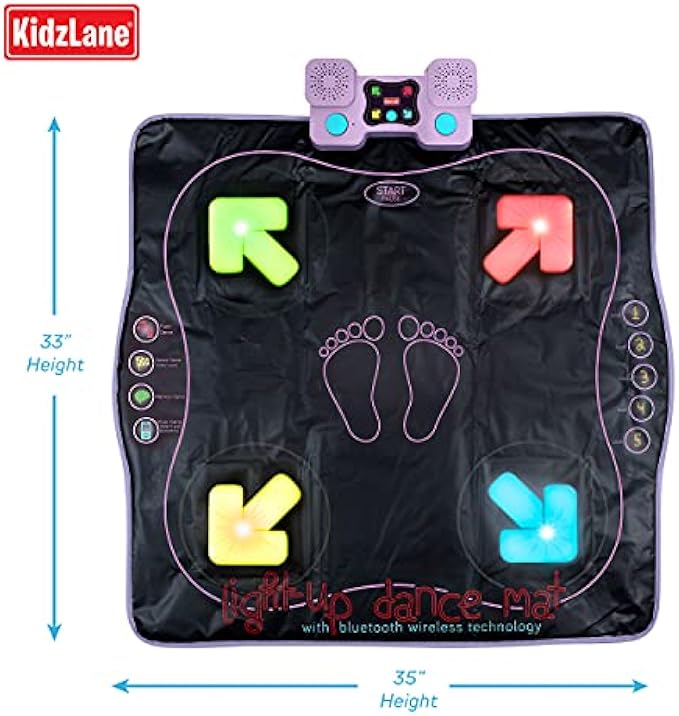 • LIGHT UP DJ DANCE MAT ? Step, hop and jump onto the blinking arrows in this addictive new dance game for kids! Follow the beat of its' built-in music, or connect your own fave track via AUX or BLUETOOTH. A well- padded dance surface & large light-up arrows make this the perfect activity from toddler to teen.