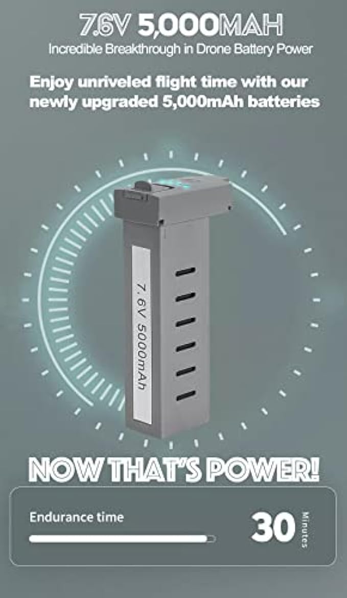 • 30 MIN LONG FLIGHT TIME PER BATTERY: Equipped with a high capacity upgraded 5,000mAh battery providing 30 minutes of flight time on a single charge--So if you have an extra battery you'll get 1hr of flight time! WANT EVEN MORE FLIGHT TIME? Enter code B07X2D3WZ9 into amazon's search bar. LIMITLESS 4 is also equipped with BRUSHLESS MOTORS: 1806 Brushless Motor Noise Reduction Fan Blade provides efficient power, low noise, extended battery life, and precision control.