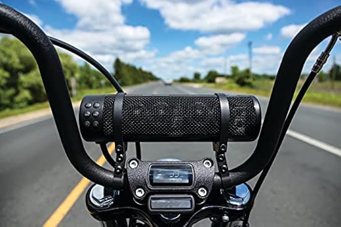 • Motorcycle handlebar mounted sound bar with 300 watt peak power and 1.0 Amp USB charging port; Speaker measures 10.6" L x 2.9" diameter, bracket measures 6" L x 3" in diameter; Mounted speaker stands approximately 5.25” from center of handlebar