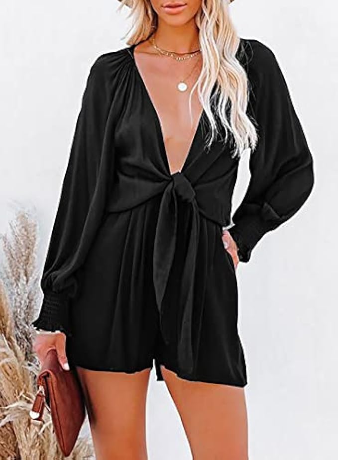 100% Polyester Imported Pull On closure Machine Wash Design Details:This long sleeve romper features front tie knot design.Two straps front the bust can be tied into a bow knot for decoration.The most important thing is that you can freely adjust the comfort according to your body, sexy or conservative is up to you. Features: Sexy Deep V-neck,Cut Out Tie Knot Front,Long Sleeve,High Wiast,Elastic Waistband,Two Side Pockets, Solid Color,Not Lined,Beach Romper. Occasion:This womens romper will be a must-have romper in your wardrobe for beach vacation,holiday,outdoor activity,party,club,dating or just daily wear. Match:Styled with the perfect hoop earrings,mini necklace,minimal herringbone necklace,compass coin necklace,crossbody envelope zip clutch,and block heeled sandal. Clothing care:Wash Recommended With Cold Water,Do Not Bleach,Hang Or Line Dry,Wash with like colours,that will increase the durability of your clothes.