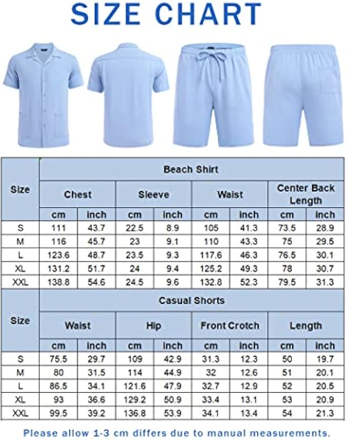 • 【2 Pieces Shirt Shorts Set】The men's summer shirt and shorts set combo features a conventional thickness, a button-down fastening, short sleeves, and a traditional plain pattern. The shirt features a cuban collar and has two pockets. Shorts feature an adjustable drawstring elastic waist and double slash and back pockets for easy storage of small items for a classic resort style.