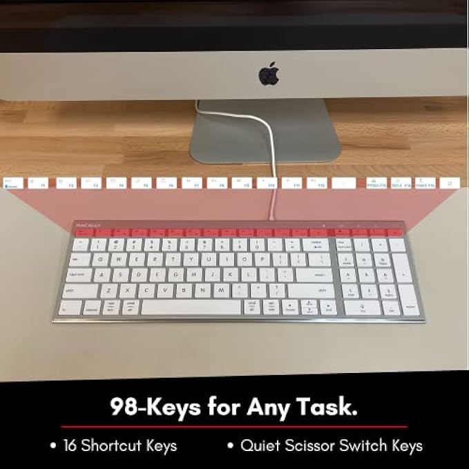 • (98-Keys for Any Task): Our slim extended keyboard features scissor switches and low profile keycaps that provide quiet keystrokes. Also, 16 preset shortcuts keys allow for easy one touch commands.